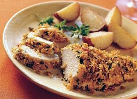 Oven-baked chicken breasts boast a delicious crunchy coating with herbs and garlic.