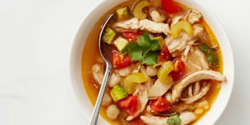 Add chicken broth, hominy, back beans, chicken and chipotles. Bring to a simmer.