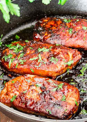Savory marinated pork chops are perfect served with some sticky white rice, and some kimchi!