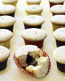 Divide batter among muffin cups, filling each cup about 3/4 full. Insert a piece of chocolate into center of each, pressing about halfway into batter to cover. Bake until pale golden brown, about 24 minutes. Transfer tin to a wire rack; let cool slightly. Dust with confectioners' sugar before serving. Cupcakes can be stored in airtight containers at room temperature up to 3 days.
