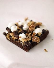 Spread mixture evenly in prepared pan. Bake until a toothpick inserted in center comes out clean, 25 to 30 minutes. Remove pan from oven; sprinkle top evenly with marshmallows, walnuts, and chocolate chips. Return to oven, and bake until marshmallows puff, about 3 minutes. Cool to room temperature on a wire rack, about 1 hour. Then refrigerate until topping hardens, about 1 hour. Use paper overhang to lift from pan; cut into 12 bars. Store at room temperature in an airtight container up to 5 days.