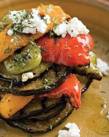 Transfer the grilled eggplant slices to a large platter, and top them with the pepper strips. Garnish with the crumbled feta and minced marjoram. Drizzle with the olive oil and lemon juice, and serve either warm or at room temperature.