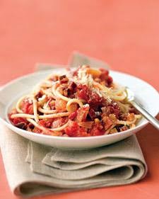 This recipe is inspired by amatriciana sauce, a hearty Italian classic that is often made to go with the extra-chewy, hollow pasta called bucatini.