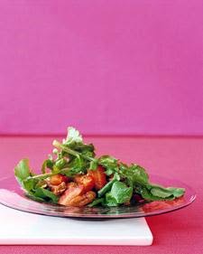To the strawberries, add vinaigrette, 1/2 cup toasted pecan halves, and 2 bunches arugula, trimmed and thoroughly washed and dried. Toss to combine, and serve.