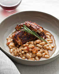 Stir the chopped rosemary into the beans and season with salt and pepper. Spoon the beans into shallow bowls, top with the glazed ribs and serve.