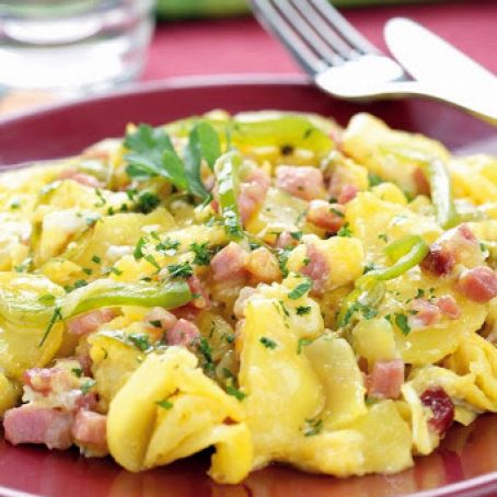 An air fryer makes it easy to make this traditional Spanish omelet, with ham, peppers and potatoes. You can also make the tapas way, "con ajo morcilla" with aillet and black sausage.