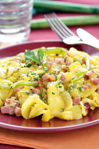 Cut the ham into a small dice or strips and add to the potatoes with the eggs and cook for another 5 minutes.