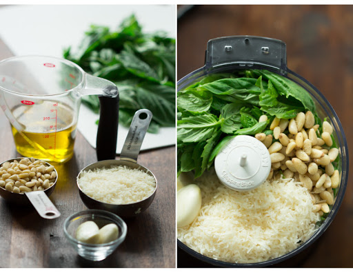 1.Combine basil, pine nuts, garlic and parmesan cheese in Food Processor.