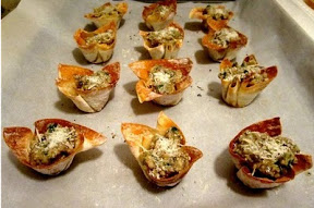 Make the wonton cups: Preheat oven to 350 degrees. Spray a miniature muffin pan with cooking spray. Insert wonton wrappers into the muffin pan so as to form small cups. Bake 5 minutes in the preheated oven. Allow the baked wrappers to cool a bit and then remove from the pan.