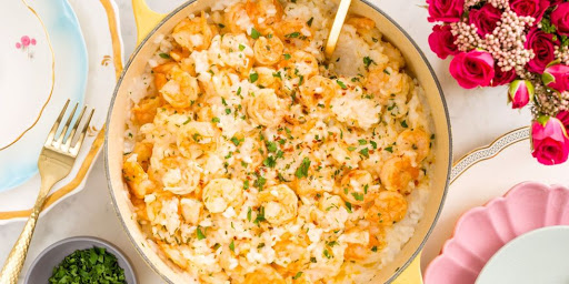 Meanwhile, cook shrimp: In a large skillet over medium heat, melt remaining butter. Add remaining garlic, lemon juice, parsley, and crushed red pepper flakes and stir, 2 minutes. Add shrimp and season with salt. Cook shrimp until pink, 3 to 4 minutes, then add remaining 1/2 cup wine. Bring to a simmer, then add shrimp mixture and Parmesan to risotto and stir until combined and creamy.