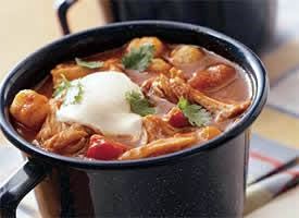3.Stir to break up chicken. Stir in hominy. Cover and cook on low heat setting 15 minutes until heated through. Serve chili with sour cream and cilantro.