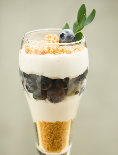 3. In the bottom of each glass, place 1 tablespoon graham cracker mix. Press down with spoon. Spoon 3 tablespoons cheese mixture on top of crumbs. (You will use only 1/2 of the mixture for the 6 glasses). Divide the cherries or berries among the glasses, placing them on top of the cream cheese layer. Add one more layer of cream cheese filling. Finish the parfait by topping each with 1 tablespoon crumbs. Refrigerator until ready to be served.