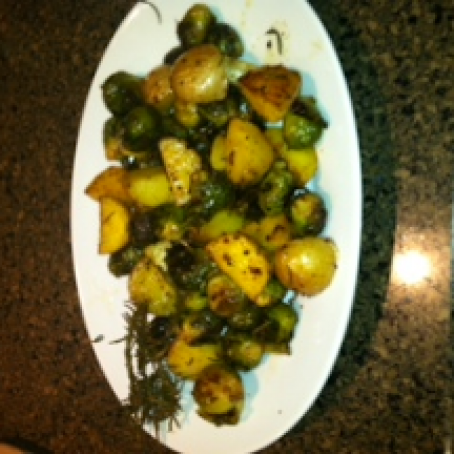 Cut the potatoes into quarters. If brussel sprouts are large cut them in half. Add all the ingredients in a large baking shhet and toss. Bake at 375 degrees until vegetables are golden brown, about 45 minutes.