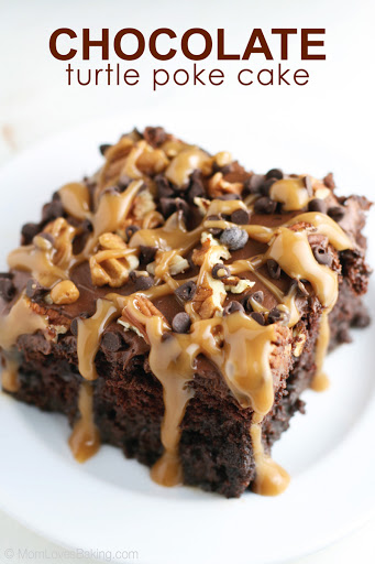 Enter Chocolate Turtle Poke Cake. It’s so ooey, gooey good! If you’re a fan of chocolate turtles, then you will love this cake. Plus, it’s very simple to make using the Caramel Flavored