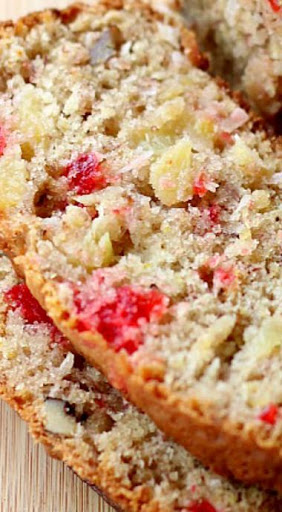 Add the walnuts, eggs, oil, banana, pineapple, vanilla, coconut and cherries; stir just until blended. Pour batter evenly into the prepared pans.