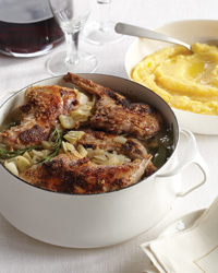 Transfer the rabbit to a plate. Discard the herbs. Boil the sauce over high heat until the liquid is reduced by two-thirds, about 5 minutes. Season with salt and pepper and return the rabbit pieces to the sauce to heat through. Serve in shallow bowls over polenta.