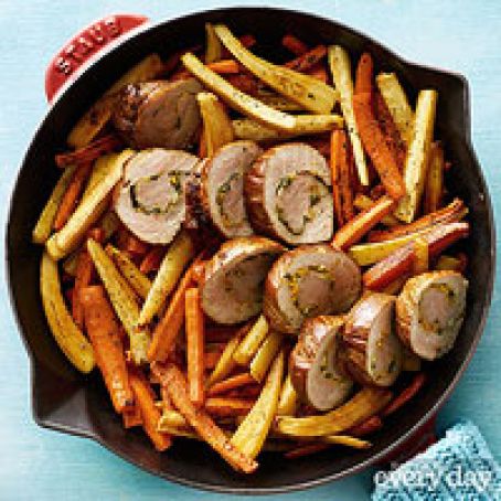 Sprinkle first 4 ingredients onto cut side of pork; season, roll and tie. In large skillet, heat oil over medium-high. Add pork; cook until browned all over, about 6 minutes. Add vegetables. Roast at 400 degrees until pork is cooked through and veggies are tender, about 15 minutes.