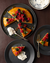 This food processor cake is moist and tender. Before serving, the cake is brushed with whiskey-laced syrup, then covered with jam-flavored fruit and served with sour cream or crème fraîche.