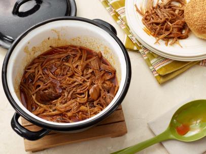 Remove the meat from the pot and shred completely. Then return the meat to the pot and keep in the juice until you need it. Divine!