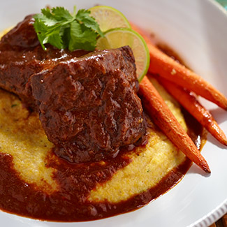 Season the short ribs with salt and pepper, then dust with flour. In a 12" skillet, heat olive oil on medium-high heat. Sear the short ribs on all sides, remove from skillet, and reserve.