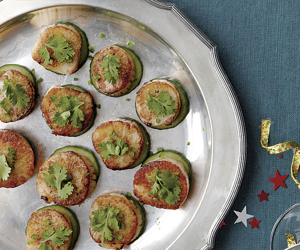 Slice twelve 1/8-inch-thick rounds from the cucumber and arrange on the chilled serving plate. Top each cucumber with a scallop. Squeeze the lime over the scallops, sprinkle with the jalapeño, and garnish each with 1 leaf of the cilantro. Serve right away.