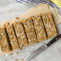 Line an 8-inch square pan with parchment paper, crisscrossing two pieces and leaving the edges hanging over the sides of the pan. Press the granola mixture firmly into the lined pan, and chill until firm (about 4 hours). Cut into bars, and store in the fridge.