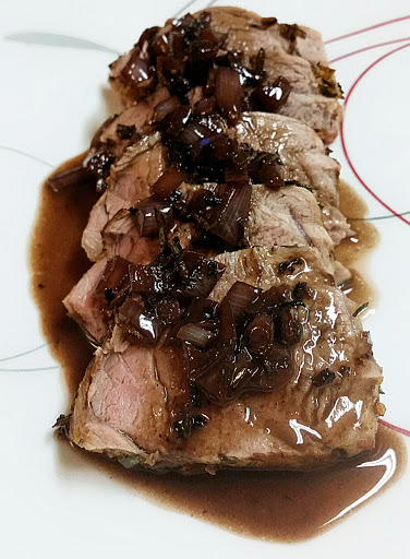 Remove pork from oven & pan/dish. Let rest for 8-10 mins. Slice, plate & cover with sauce.