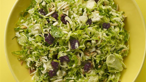 Combine Brussels sprouts, dried cherries, almonds, and Parmesan cheese together in a bowl; add dressing and toss to coat.
