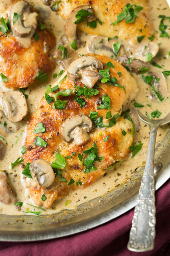 While chicken is cooking, melt butter in a separate skillet over medium heat then add mushrooms and garlic and saute until mushrooms just begin to soften, about 3 minutes.