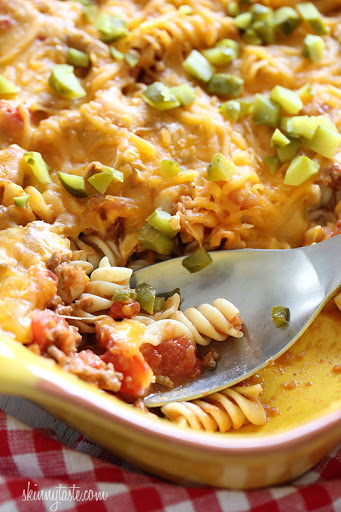 Toss the meat mixture with the pasta and spread it into the prepared dish. Top with the cheddar and bake until the cheese is melted, about 15 minutes. Sprinkle the chopped pickles over the top and serve. Makes about 9 cups