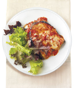 4.Spread half the tomato sauce in the bottom of an 8-inch square baking dish. On top of it, layer a third of the eggplant slices and half the ricotta mixture. Repeat with another layer of eggplant and ricotta. Top with the remaining eggplant and tomato sauce. Sprinkle with the Asiago.