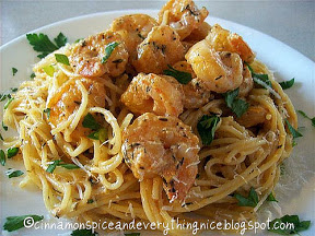 In the meantime, prepare sauce. Sauté the garlic in the olive oil on low heat in a deep sauté pan for two-three minutes. Add milk and heavy cream, turn heat up to medium and bring just to a simmer. Add shrimp and the rest of the seasoning mix, simmer until the shrimp curl up and turn pink. Sprinkle in cheese and add butter. Stir until butter melts, turn off heat.