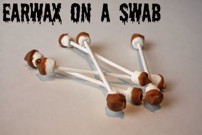 These are so easy and quick, I made them last year too... simply poke mini marshmallows on either end of a lollipop stick. Over a double boiler or in a microwave, melt butterscotch chips until smooth (or you can use peanut-butter flavoured Wilton candy melts). Gently dip each end of the "swab" in the melted candy and lay to set on waxed paper. Do not refrigerate.