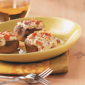 Place in a greased 15-in. x 10-in. x 1-in. baking pan. Sprinkle with remaining bacon bits. Bake, uncovered, at 375° for 18-22 minutes or until mushrooms are tender.