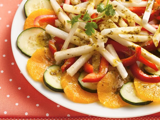 2. On serving platter, alternate slices of orange and cucumber around edge. Mound bell pepper and jicama in center. Drizzle with dressing. Sprinkle with chili powder and/or cilantro sprigs.