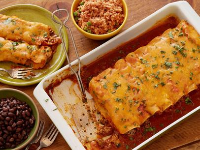 Spread 1/2 cup of the sauce in the bottom of a 9 by 13-inch baking dish. Dip each tortilla into the sauce. Set the sauce-soaked tortillas on a cookie sheet. Onto each tortilla, place some of the meat mixture, black olives and green onions. Top with a generous portion of grated Cheddar. Roll up the tortilla to contain the filling inside.