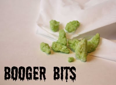 Pour the remainder of your lime Jell-O package in a bowl and lightly roll each booger in the powder to finish it... the boogers will get a nice crust and take on a neat lime shade. Place on waxed paper and return to the refrigerator for an hour before serving.