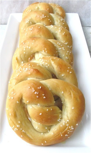 Very carefully lift the long skinny piece of dough to the cookie sheet. Twist it carefully into the shape of a pretzel–or the shape of letters, hearts, I even flattened out a few pieces and used a cookie cutter to make some cool shapes.