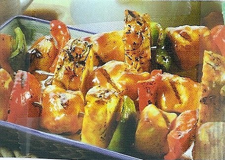 Thread skewers alternately with chicken, green and red pepper chunks and pineapple chunks