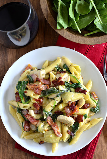 Chicken, Bacon, and Artichoke Pasta with Creamy Garlic Sauce - Iowa Girl Eats