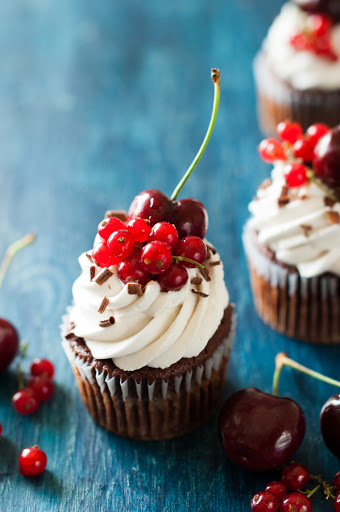Garnish with 1 cherry each, fresh currants, and chocolate shavings.