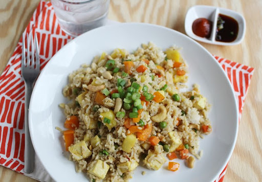 You could easily substitute the tofu for cooked shrimp or chicken, or even leave it out entirely. The very best thing you can do to elevate homemade fried rice is use day old rice. Weird, right? This will help to ensure your dish doesn't turn out soggy or clumpy. Just cook the cup of rice in two cups of water the day before you plan to use it and store in an air tight container in the refrigerator.