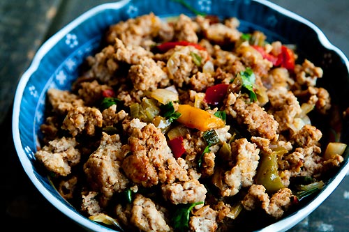Quick and easy, sautéed ground turkey with onions, garlic, bell peppers, and seasoned with chipotle chili.