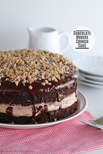 To assemble the cake: Using a serrated knife, level the domes off of the cooled cakes. Place one of the cakes on a serving plate. Spread the mousse over the top of the cake. Sprinkle with Heath bits. Place the second cake on top. Spoon the ganache over the top of the cake, allowing it to drip over the sides. Sprinkle with additional Heath pieces. Refrigerate until ready to serve.
