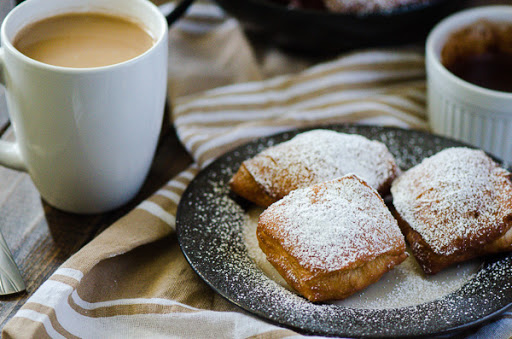 Heat oil to 350 degrees F and fry dough 4-6 squares at a time, flipping every 30 seconds or so, for 2-3 minutes until golden brown on both sides. If beignets do not pop up or take longer than 3 minutes, turn up the heat - your oil is not hot enough. Remove beignets with a slotted spoon and drain on paper towels.