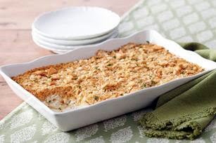 Lightly crush Ritz crackers and spread over top of chicken mixture.