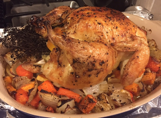 6. Place the onions, carrots, and fennel in a roasting pan. Toss with salt, pepper, 20 sprigs of thyme, and olive oil. Spread around the bottom of the roasting pan and place the chicken on top.