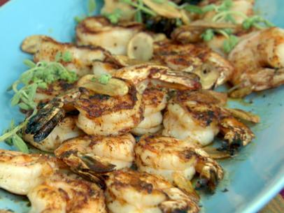 Remove the shrimp from the marinade, season with salt and pepper and grill until golden brown on each side, about 1 1/2 minutes per side. Remove the shrimp from the skewers, transfer to a platter and drizzle with some of the reserved garlic oil and the garlic chips. Sprinkle with the remaining thyme and garnish with oregano leaves.