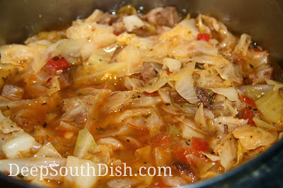 Stir in the cabbage, carrot, potato, vinegar and seasonings. Cover and continue to simmer another 25 to 30 minutes, or until cabbage and vegetables reach the desired level of tenderness. Taste and adjust seasonings as needed before serving. May serve as is, or over cooked rice.
