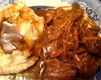 Add the stick of butter on top! The butter is what makes the gravy in this soooo good! Set your slow cooker to 8 hours on low and forget it. You do not add any additional water to this! Your roast will be tender and delicious and will have made it's own gravy! I served with mashed potatoes, but you could serve with egg noodles or rice.